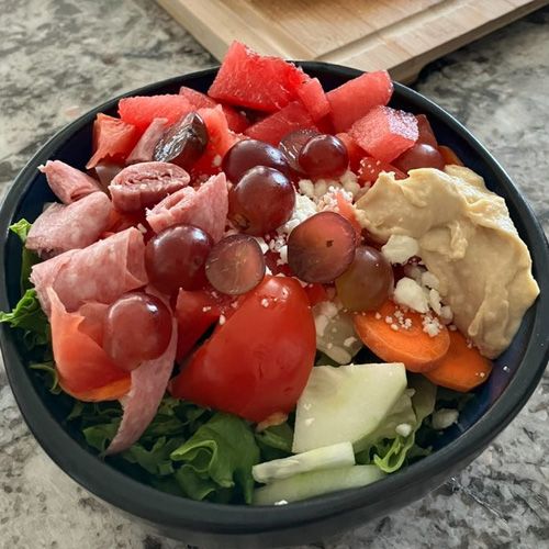Chunk White Water Packed Tuna Fish & Cottage Cheese in a bowl, add in tomato, avocado, carrot slivers, handful of almonds, walnuts, salt & pepper. 600 calories.