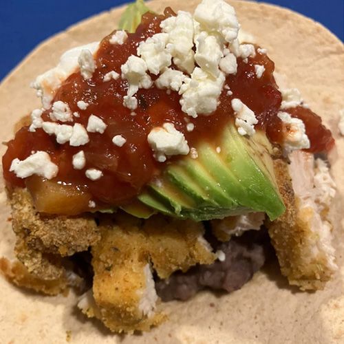 2 cup White Rice bowl with 35-40 grams of protein from Air Fried Chicken breast, diced 1/2 large Tomato, whole diced Avocado. I add a pinch of salt & pepper and a little balsamic oil & red wine vinegar. 600 calories